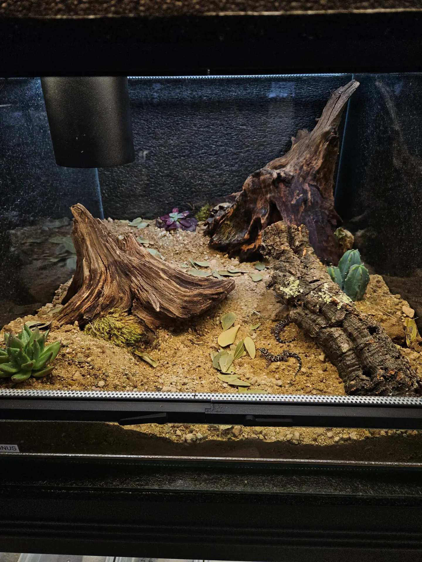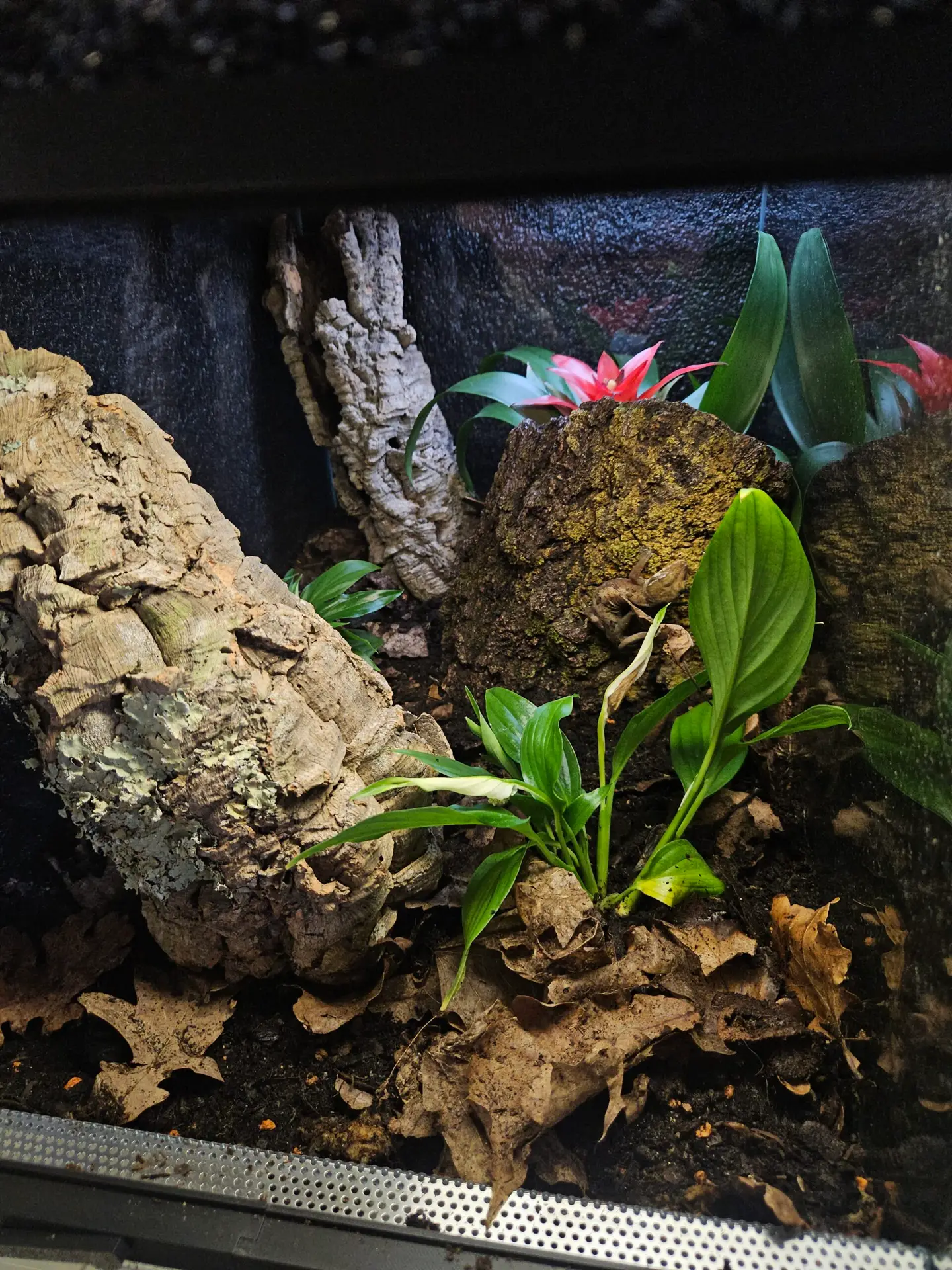 Dbamy także o roślinność — ważny element terrarium. Dla komfortu zwierząt i estetyki stosujemy naturalne rośliny, korzenie oraz elementy aranżacyjne.